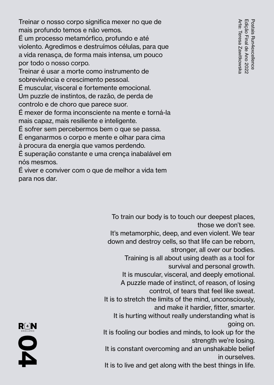 Postais impressos com elevada qualidade gráfica e em papéis de primeira escolha. Com este projecto pretende-se publicar de forma regular postais correspondentes a momentos importantes do projecto run4excellence, que permita por um lado a sua coleção e por outro a passagem de importantes mensagens relacionadas com o projecto. A escolha das imagens será alusiva a cada momento, mas sempre com a utilização de fotos ou trabalhos de diferentes artistas relativos à corrida ou treino com elevado impacto e qualidade. Neste caso com um excepcional trabalho de Teresa Zawitkowska.