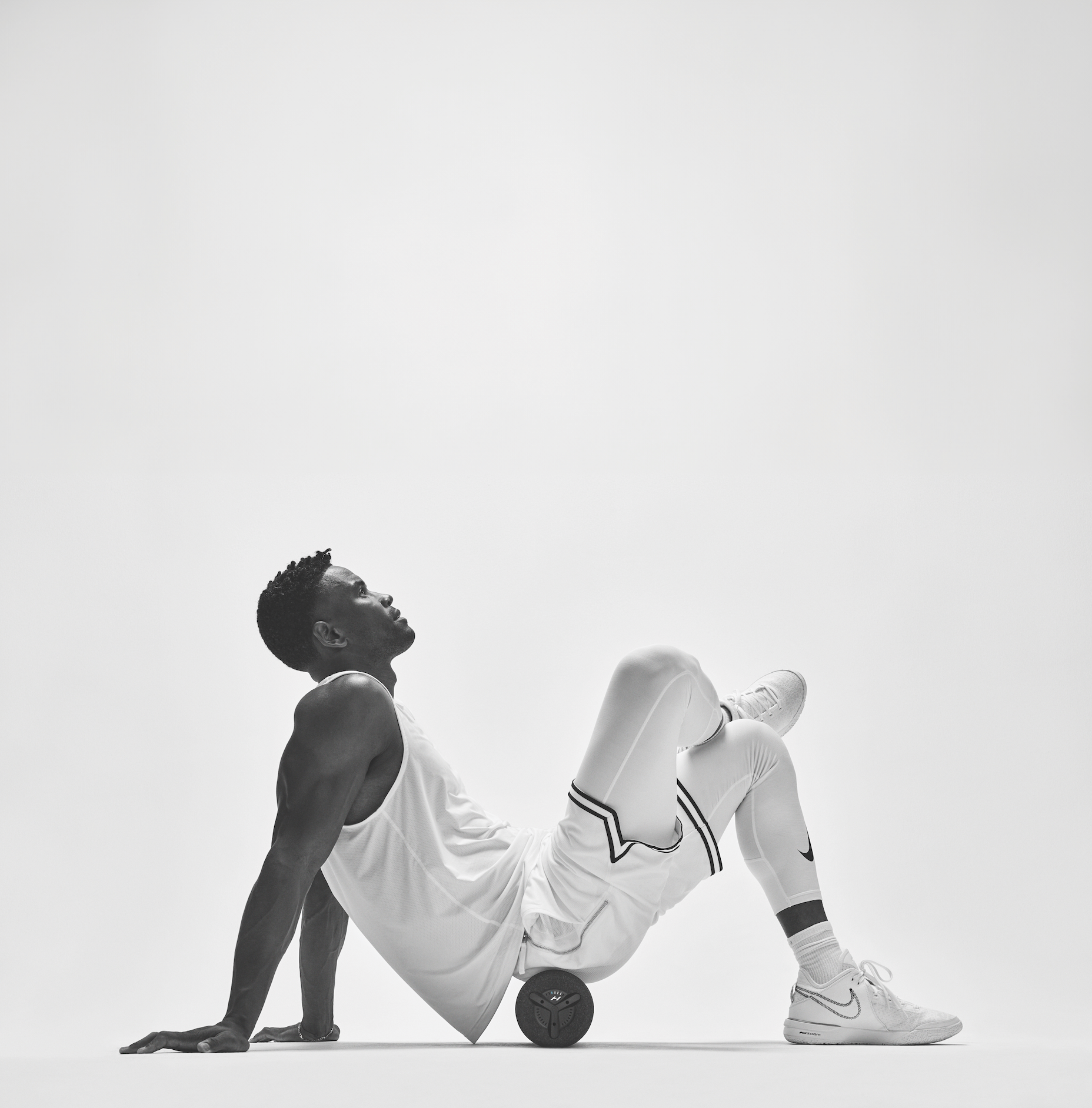 • Homem em roupa desportiva branca usando rolo de massagem preto